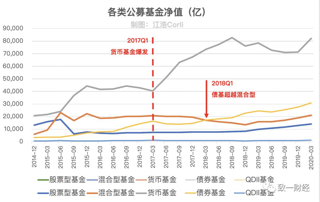 从图中的红色箭头可以看到,2018年一季度债券型基金的规模超过了混合型基金,成为货币基金以外的第一大公募基金类型(下文是对年轻人投资债基的分析,但是债基的主要投资者还是各类机构)。