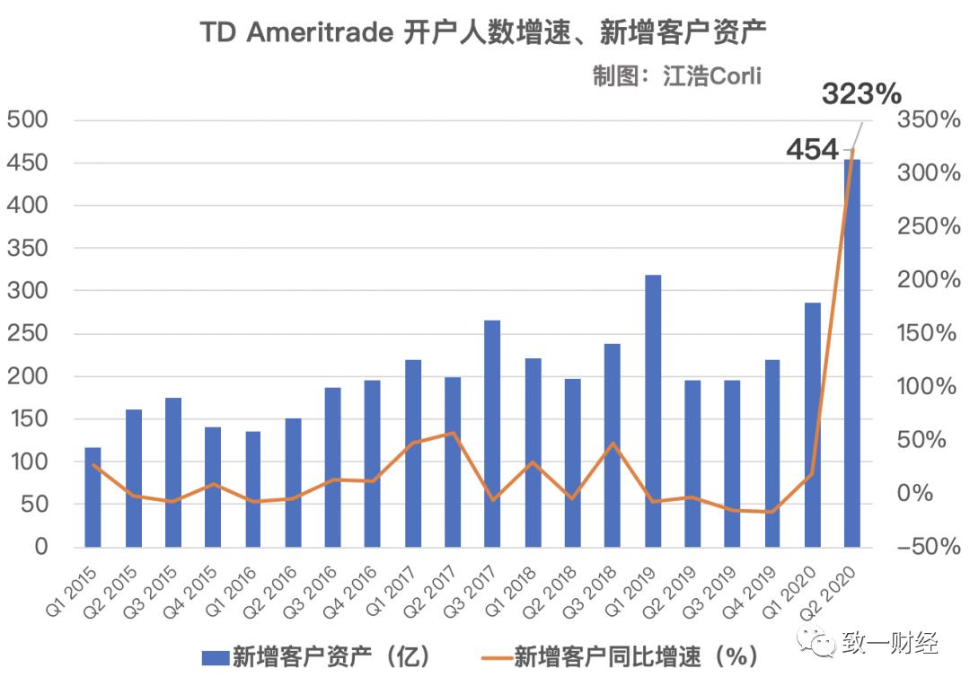 散户化也可以从另一面来证明,也就是上文提到过的散户交易软件的开户情况(Schwab和E*Trade的环比增长达到10%),这里以TD Ameritrade为例,2020年第二季度开户人数预计增长323%,新增客户资产454亿,双双创下历史新高。