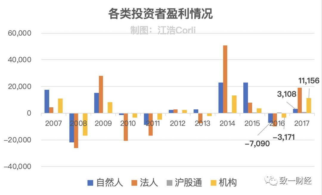 2017年:自然人收益3108亿,机构收益11156亿。