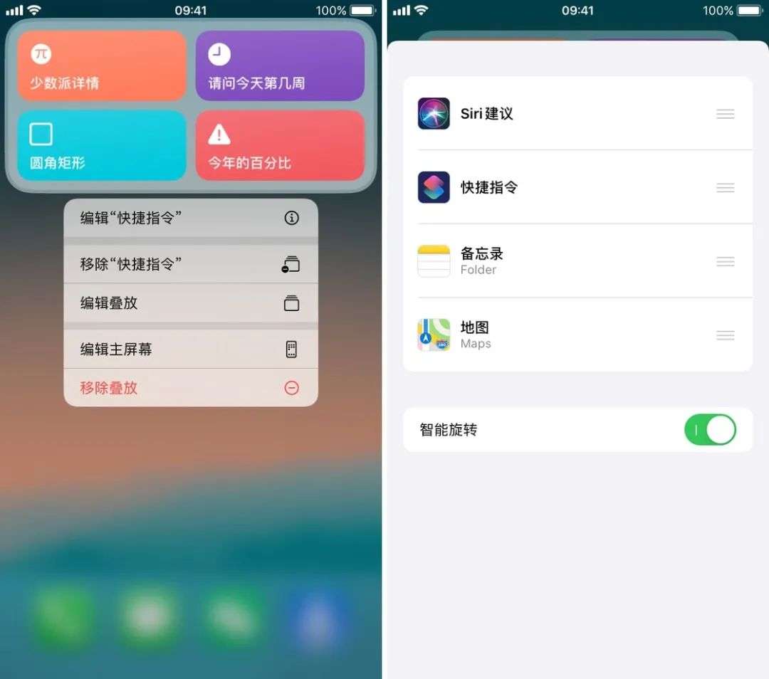 手动创建「叠放」的功能并不仅限于普通小组件,即使是「智能叠放」,你也可以对里面的小组件进行增删。增加的方法与创建「叠放」一样,而删除小组件,只需要长按后点击「编辑叠放」,随后在弹出菜单中左滑删除即可。当然,如果你只想删除叠放中的某一个小组件,也可以先切换到该组件,长按后直接点击「移除 XXX」就行了。