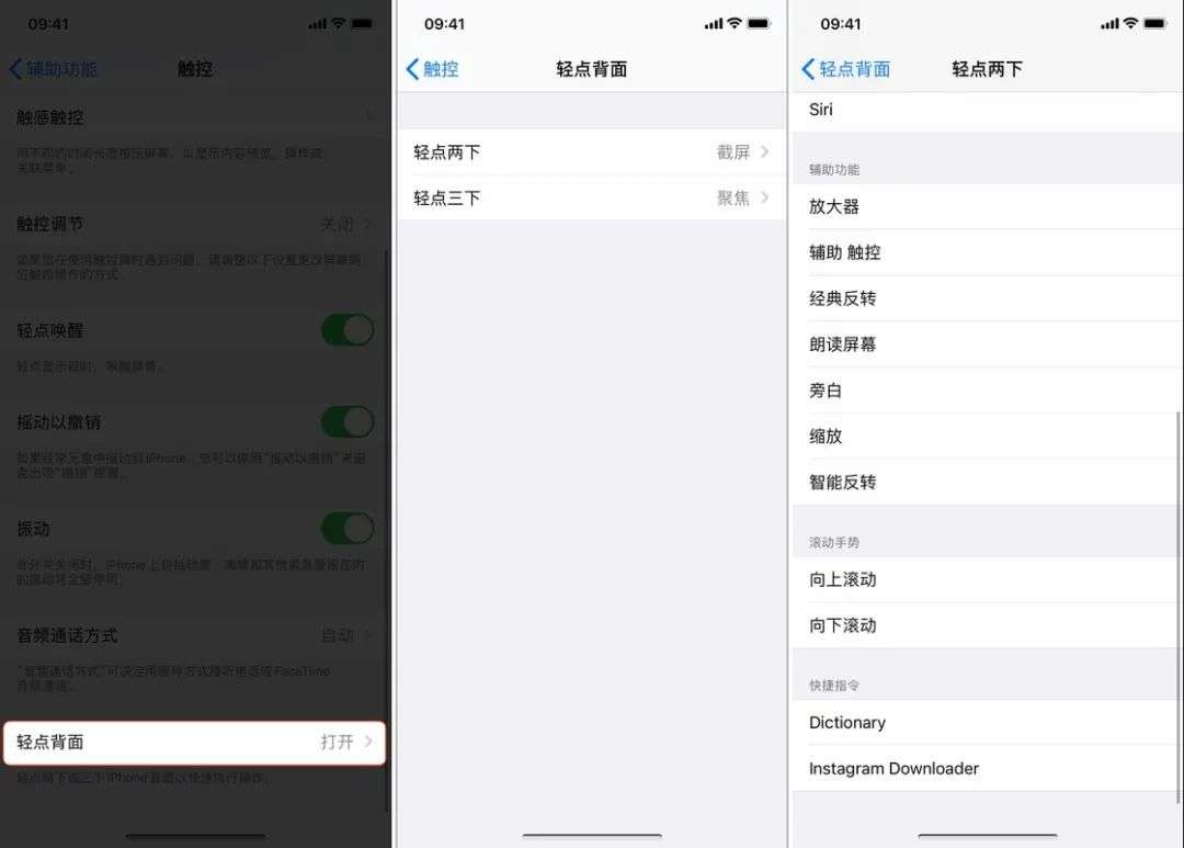在「设置 - 辅助功能 - 触控」里,iOS 14 还新增了「轻点背面」的功能。你可以敲击手机背部两次/三次来触发操作,比如截图、返回主屏幕或是运行某个快捷指令。这一功能目前仅支持全面屏 iPhone,且根据微博网友反馈,误触率较高。