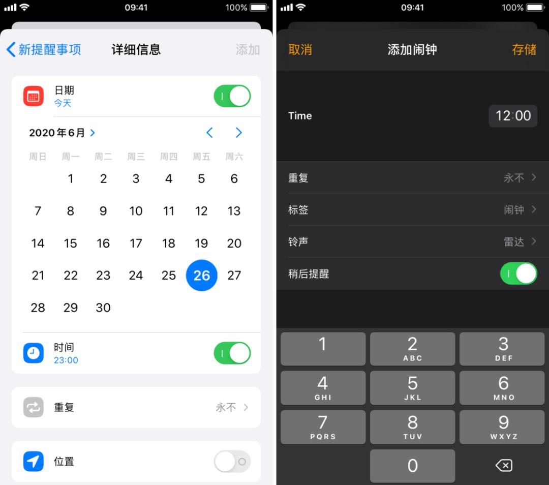 除了输入法的改动,iOS 14 还对选择日期/时间的控件进行了更新。在一些需要选择日期或时间的地方,系统将不再使用滚轮来选择。尽管在修改后能够更加精确高效地设置日期、时间,但取消滚轮的设计无疑让 Taptic Engine 的乐趣又少了一个。