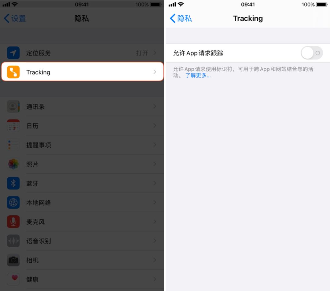 除此之外,「设置 - 隐私」里还新增了「Tracking」的选项。你可以在里面找到「允许 App 请求跟踪」的开关,它在默认情况下是关闭的,在关闭状态下,应用无法获取你的设备标识符。