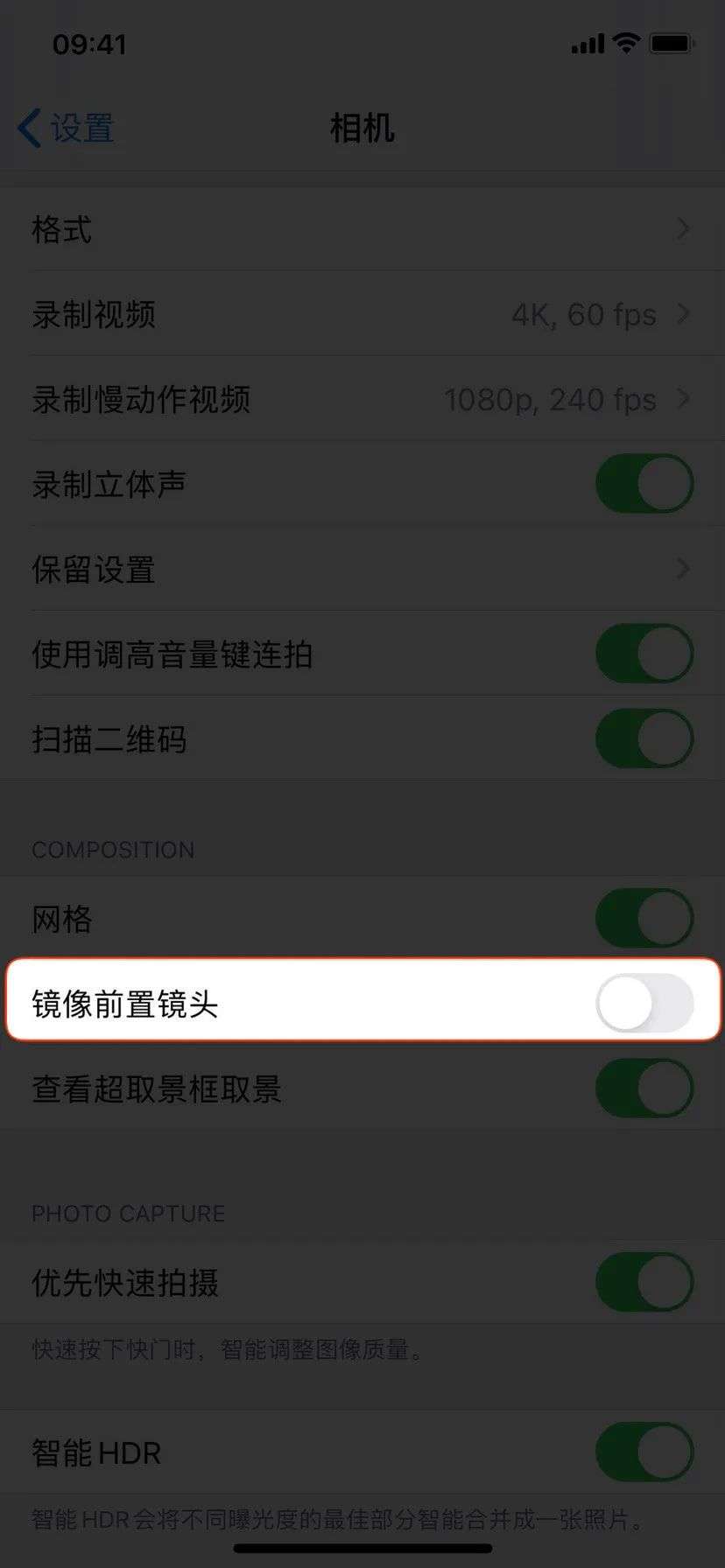 另外,你可以在「设置 - 相机」里找到「镜像前置镜头」的开关。开启后,用前置镜头拍摄的照片就会自动以镜像画面来保存,算是对系统相机的一次功能补全。