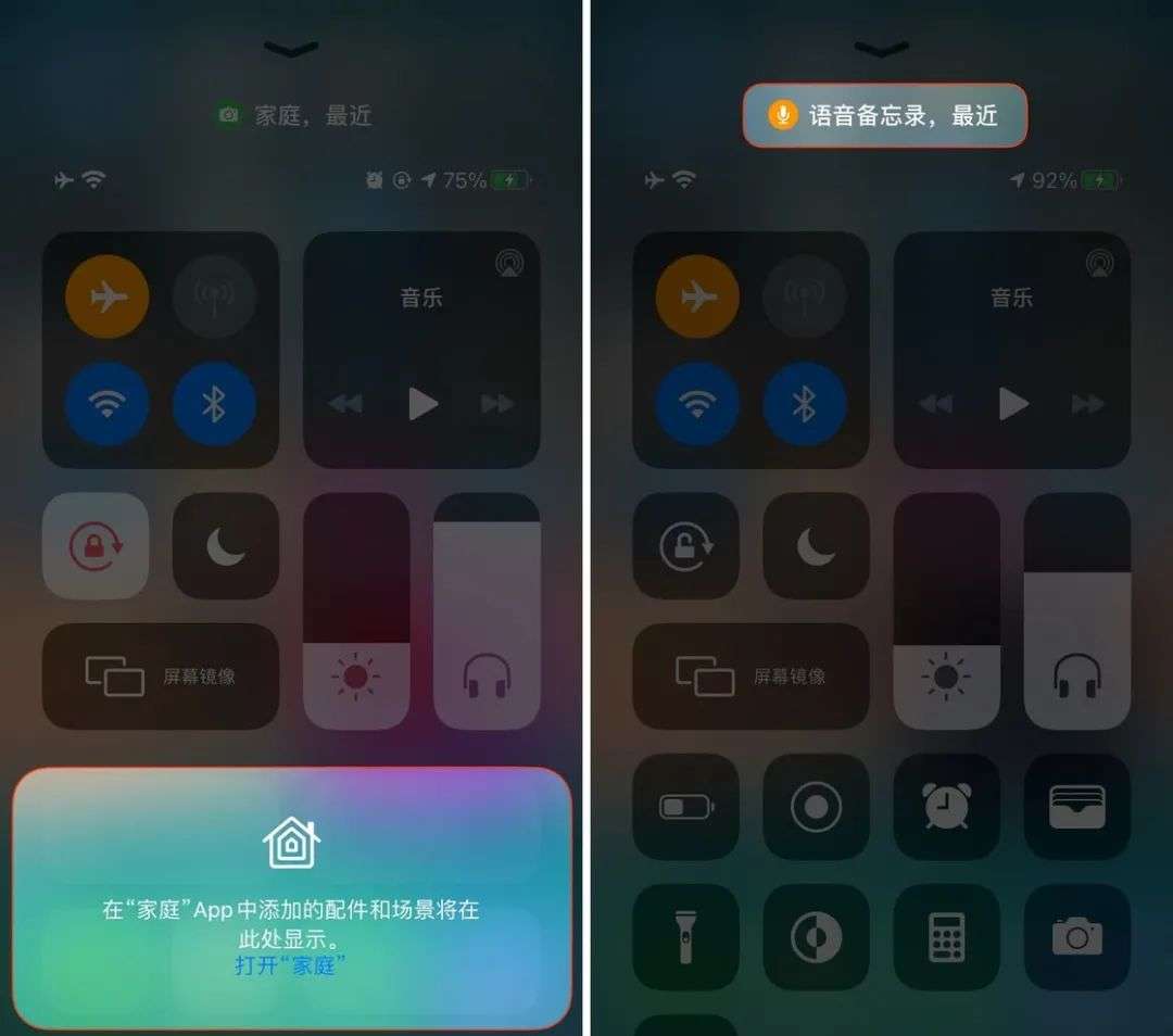 在 iOS 14 中,控制中心迎来了小幅调整。首先是加入了「家庭控制」的开关,如果你有支持 HomeKit 的设备,你就可以直接在控制中心中对其进行操作。此外,在控制中心顶部还加入了隐私提醒,如果最近有 App 调用过你的摄像头或麦克风,系统便会在控制中心顶部提醒你。