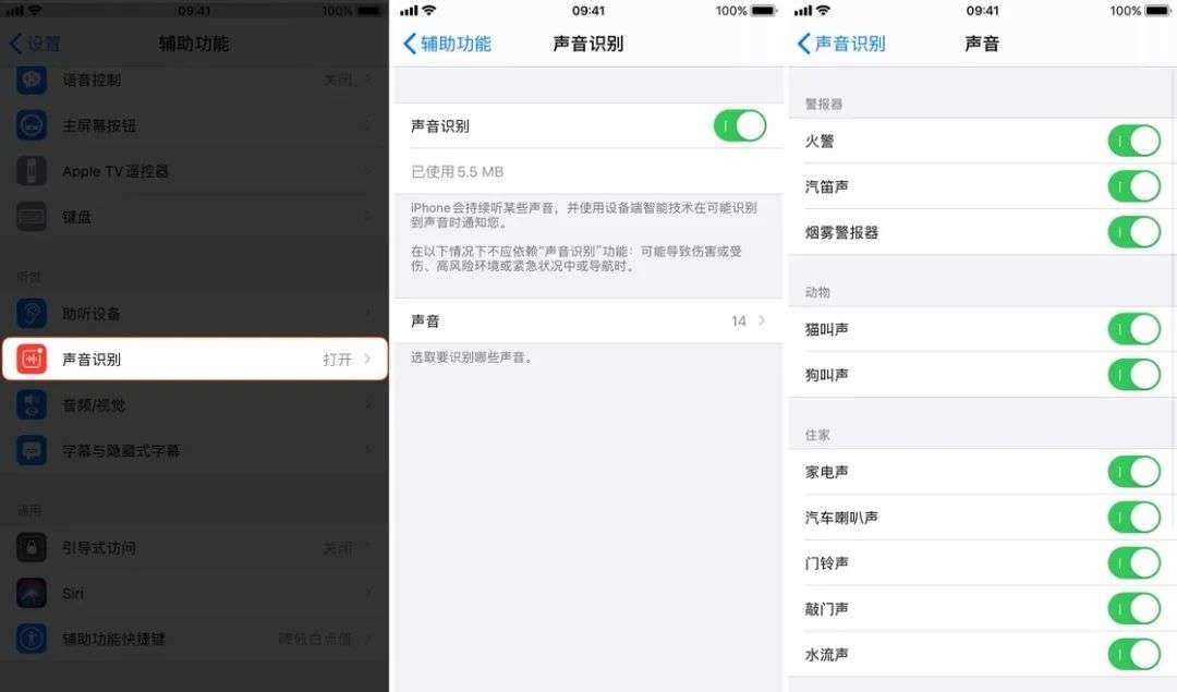 不仅如此,iOS 14 还加入了识别外部声音的功能,你可以在「设置 - 辅助功能 - 声音识别」里进行设置。目前支持各类警报声、动物叫声等 14 种声音。当系统识别到你的周围有这些声音时,就会发送消息提醒你。