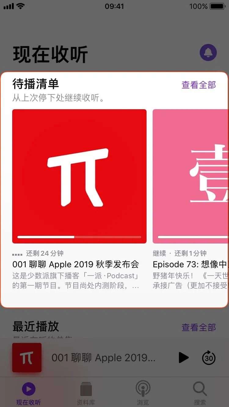 iOS 14 还对播客应用进行了小幅度的修改,在「现在收听」界面里新增了「待播清单」,方便你继续收听还没听完播客。