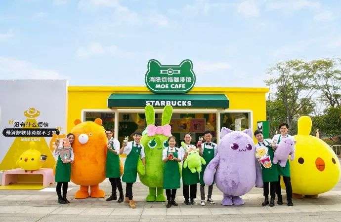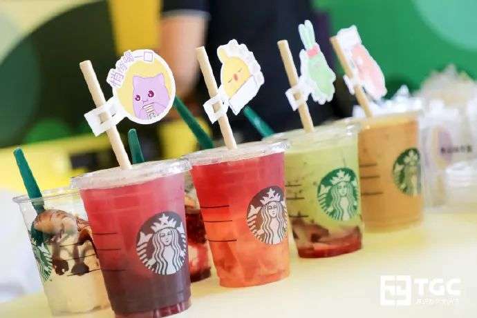 这是星巴克与《天天爱消除》在海口TGC数字文创展,联合打造的一个临时性的线下游戏主题咖啡馆。4个以人偶服形象出现的IP形象,和星巴克店员一起,在消除烦恼咖啡馆前,引导玩家体验互动环节。在这次活动中,星巴克也同时推出了8款IP主题的星巴克饮品。