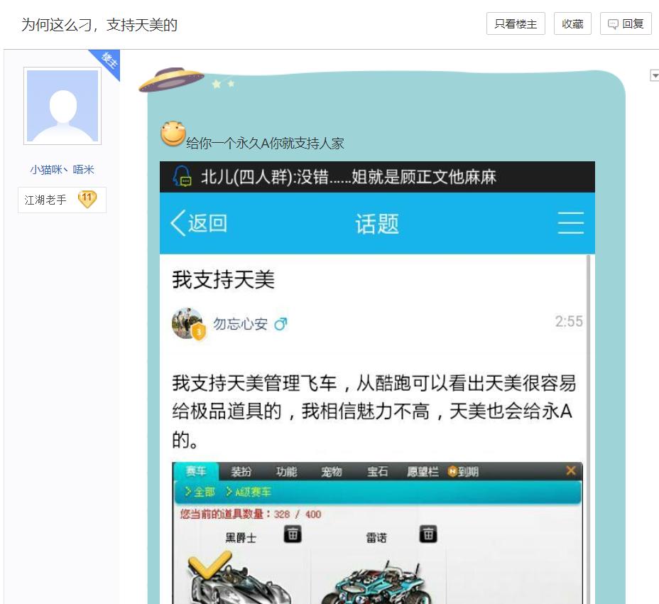 当年1月的一天,一位百度贴吧用户在凌晨写了一条题为“我支持天美”的帖子,大意是相信天美会给《QQ飞车》端游玩家非常多福利,结果不到半天时间,竟涌入了数十条持相反观点的评论。