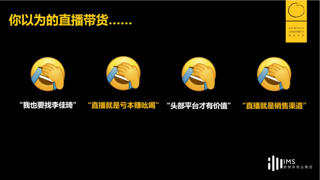 最近几个月,所有相关不相关的人,所有不同角色的人,已经全部参与到直播带货这个体系了。大家可以看到,明星、名人在做,网店里面的掌柜在做,很多专业人士和CEO也在做,所以现在行业里经常有一句话说,不要管你的粉丝有多少,也不要管你有多牛,一场直播带货下来,你就可以看到自己的商业控制能力和商业变现能力究竟如何。