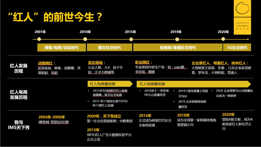 所以,无论时代怎么变换,唯一重要的体系就是人。未来所有的商业由人开始,也由人结束。红人不再是一个贬义词,而是能够扩散正能量,推进知识迭代、商业迭代的重要节点。由这些节点所连成的面,构成了我们今天每一个人所能看到的红人经济、直播带货的历史。