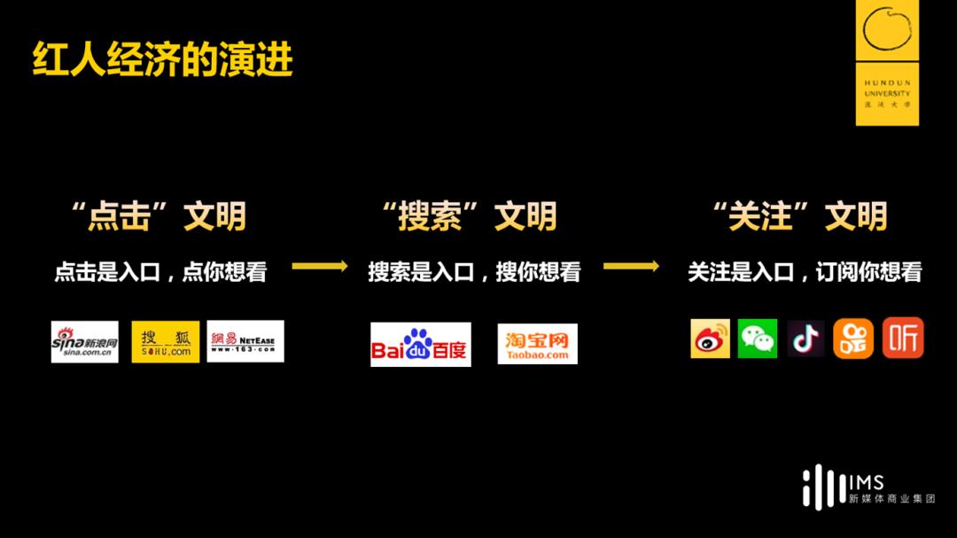 在关注时代,人们的行为由搜索信息变成了关注人,因为关注这个人,关注者获得了非常多的信息。这是诞生红人经济一个非常核心的基础。