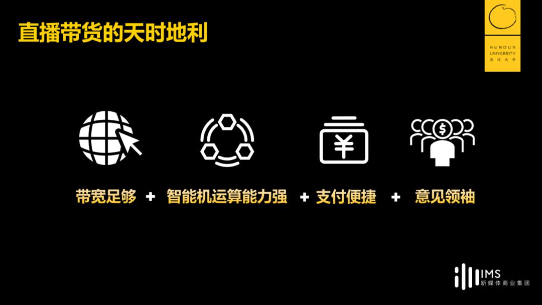 线下硬件的建设,加上线上硬件的带宽、网络处理速度和快捷支付,构成了中国在全世界范围内最好的线上加线下的网络。所以直播带货在中国同时具备天时地利,而在全世界其他地方,都没有这么好的线上和线下条件。