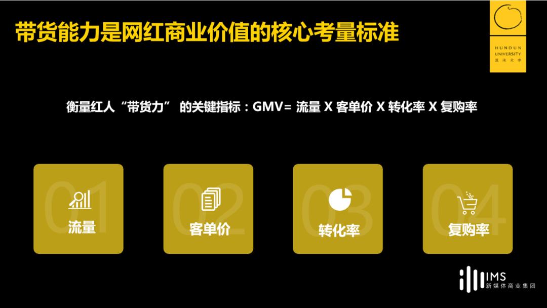 接下来看能力。衡量直播带货的“带货力”,有一个核心公式:GMV= 流量 X 客单价 X 转化率 X 复购率。衡量一个红人带货的核心标准,流量、客单价、转化率、复购率这些指标与传统指标并无不同。