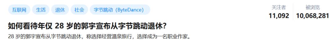 最近,知乎上一个提问“如何看待年仅 28 岁的郭宇宣布从字节跳动退休?”火了,阅读讨论次数上千万。