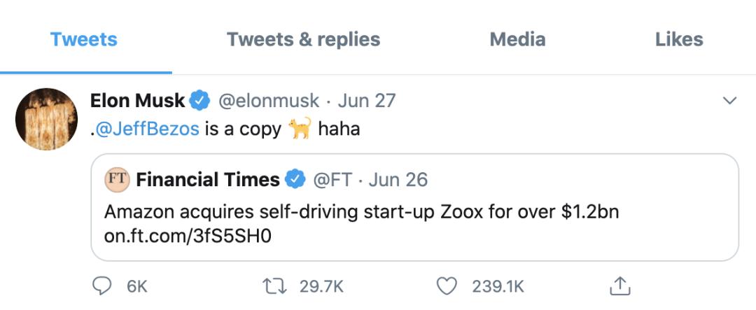 马斯克又一次炮轰亚马逊 CEO,在 Twitter 上说贝佐斯「跟风」(Jeff Bezos is a copycat)。