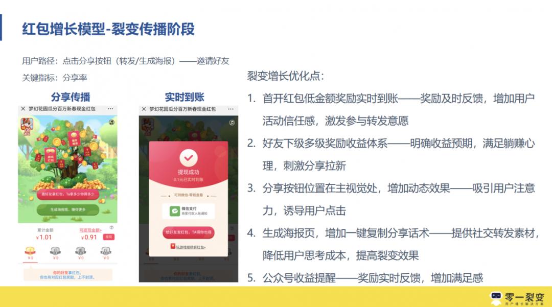 我们对红包这个事情的理解是:虽然只是个单一要素,但必须要拆解到足够细的颗粒度。当你把红包这个激励要素放在整个用户生命周期包含传播和转化过程来看,一定可以看到更多的激励维度。