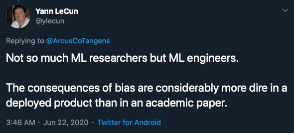 「与学术论文相比,这种偏见在已经部署的产品中产生的后果会更加可怕。」这句话的含义被解读为「不必为此特例而过分担心」,引发了诸多同行的质疑。