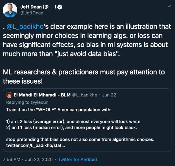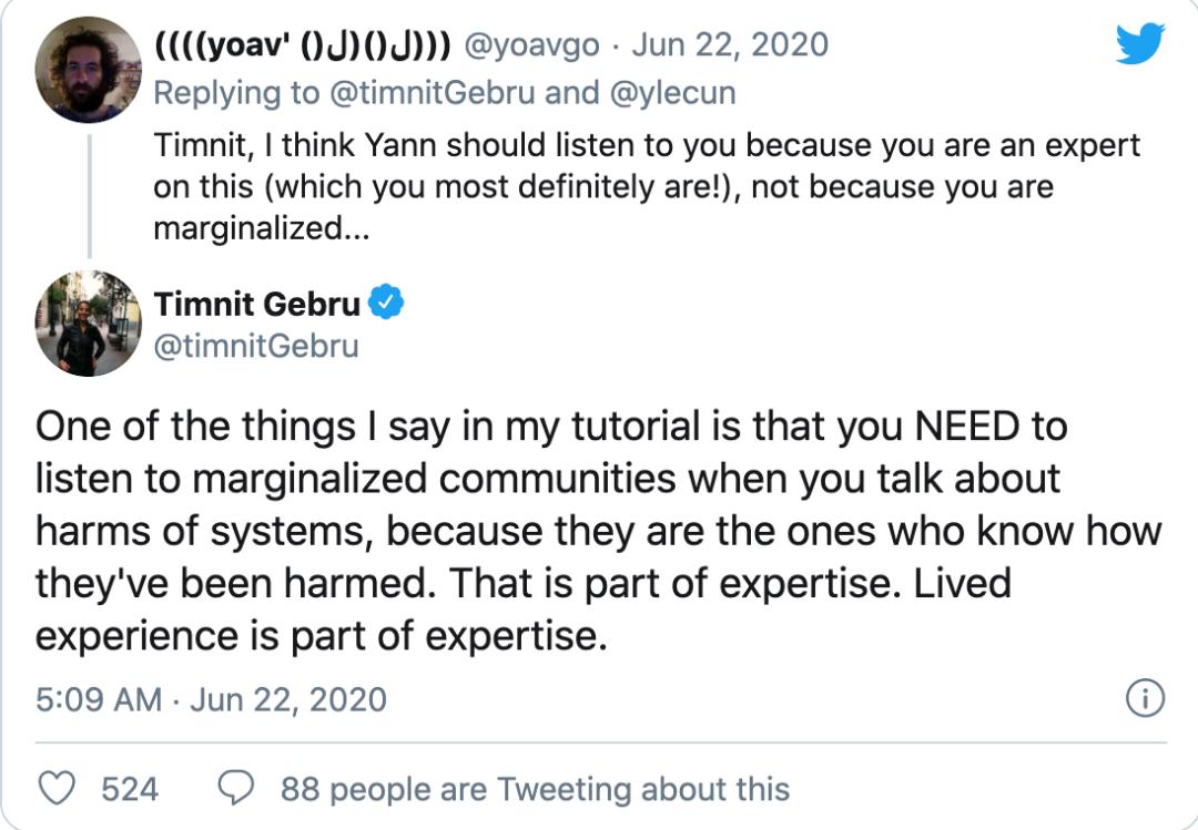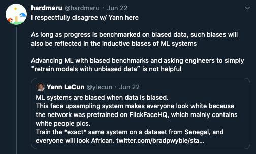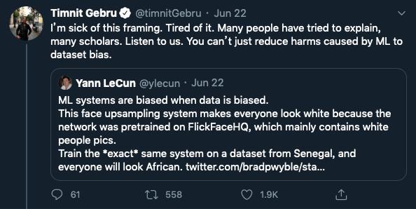 斯坦福 AI Lab 成员、Google AI 科学家 Timnit Gebru(她是一名非洲裔美国人),对 LeCun 的言论表示「失望」。
