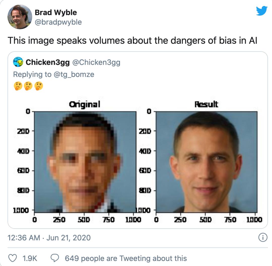 但这件事还没完,鉴于美国目前 BLM 的舆论环境,人们很快就开始深入讨论机器学习研究结果缺乏多样性的问题。在这其中,种族偏见和性别偏见的问题一直存在,迄今为止却没人给出一个好的解决办法。