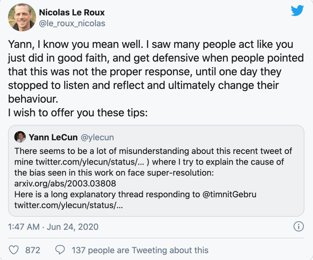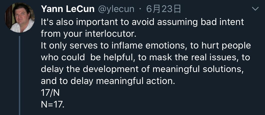为了达成没有偏见的目标,我们必须让整个人工智能社区行动起来。但在有关技术的讨论之中让技术大牛心灰意冷,是大多数人都不想看到的结果。Yann LeCun 此前一直以直言不讳著称,他在社交网络上经常会对热门的深度学习研究发表评论,也可以直面其他人工智能著名研究者的批评。