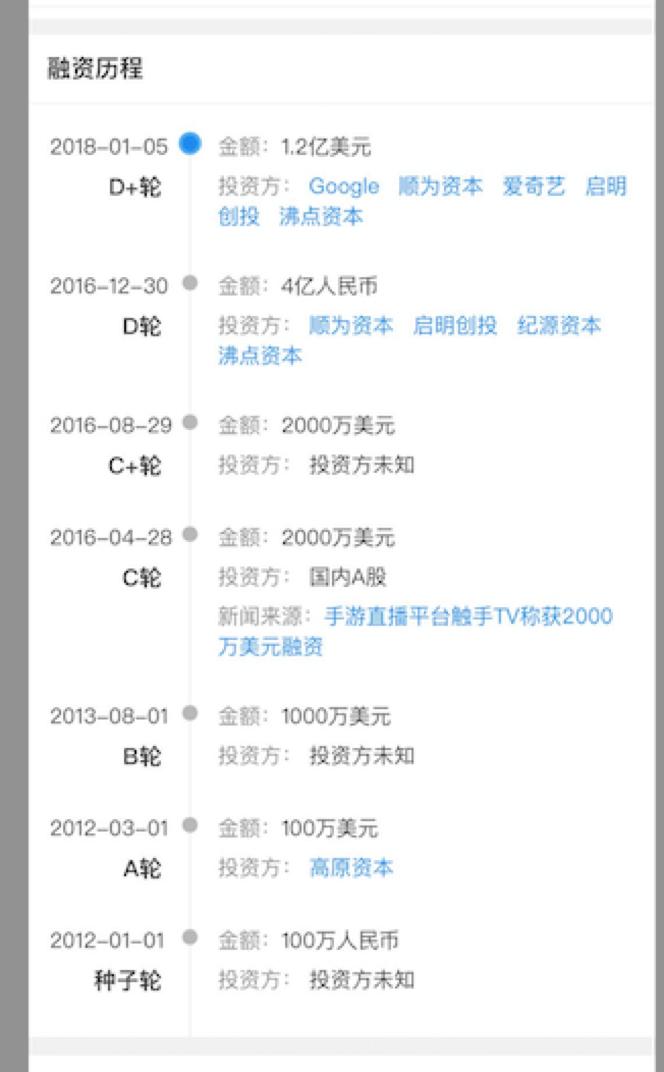 根据第三方资料显示,触手自成立之后,一直到2018年,都很受资本的追捧,也成功有过多轮融资。尤其是D轮和D+轮的投资方,更是星光熠熠,google是全球的互联网巨头,顺为、启明等企业也不用过多介绍,能被这些机构投资,至少说明,在当时,他们是看好触手直播所在的游戏直播赛道的,这或许也是支撑触手直播挺过“千团大战”的原因之一。