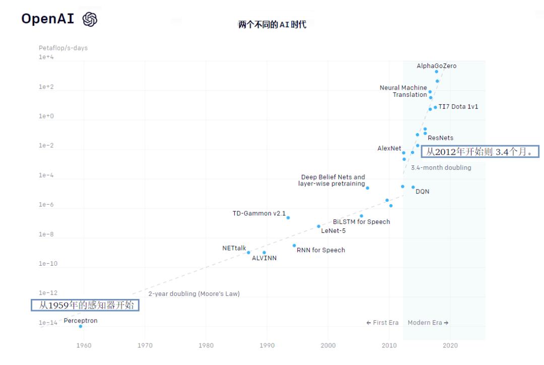 摩尔定律说,芯片性能翻倍的周期是18个月。Open AI说,人工智能训练模型所需要的计算量的翻倍周期是3.4个月。