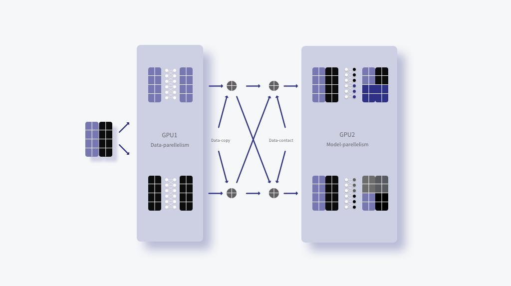 模型太大,就需要把模型拆开。比如说神经网络前几层拆在这个GPU上,后几层拆在另一个GPU上,或者神经网络中某一层被切割到多个GPU上去了。