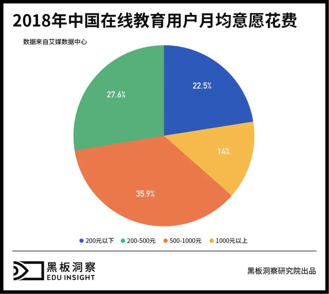 那么,大厂入局教育,未来之路在哪里?首先,我们认为不同消费层次的受众,需要不同形态、不同层级的教育产品。艾媒数据中心发布的2018年中国在线教育用户月均意愿花费图显示,不同消费观念的用户教育意愿花费存在明显差异,约22.5%的用户月均意愿教育花费低于200元,14%的用户月均意愿教育花费高于1000元。