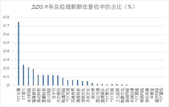 统计A股董事长年薪与公司营业收入的比值,*ST大晟尤为值得注意。2019年*ST大晟的董事长年薪在该公司营业收入的占比高达0.69%,远远高于行业中位数0.05%。