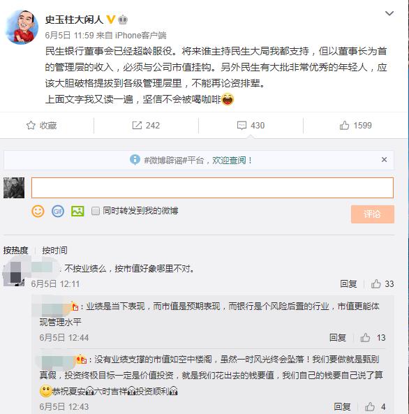 “民生银行董事会已经超龄服役。将来谁主持民生大局我都支持,但以董事长为首的管理层的收入,必须与公司市值挂钩。”6月5日,在民生银行董事会换届前夕,该行明星股东、现任非执行董事、巨人网络董事长史玉柱在微博发声。
