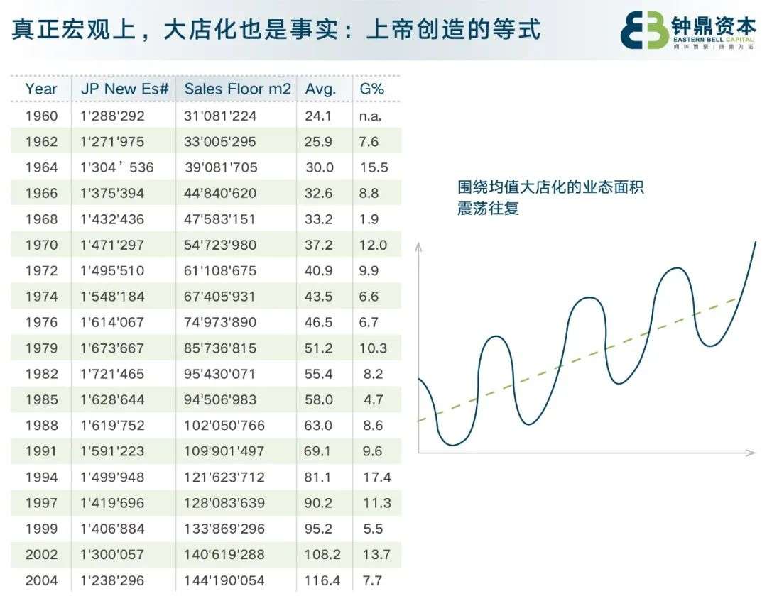 从更宏观更广阔的视角来看,整个零售业确实有“店越开越大”的趋势。还是拿日本作例子,从六十年代到两千年之后,我们取出当年新建的零售店数(第二列)和当年新增的零售营业面积(第三列),就能算出每年新开门店的店均面积(第四列)——从以前20+平涨到100+平,大店化是真实发生的。