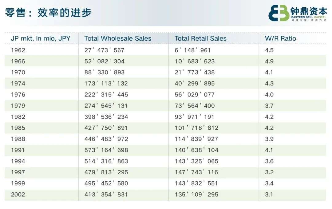 下图为日本从六十年代到2000年以后的数据,第2列是全社会各级分销商的商品批发总额,第3列是全社会终端零售额,所以最右列除数W/R ratio的数字越小,意味着全市场的商品流通更加高效。能看到,尽管中间有波动,但整体W/R Ratio呈明显下降,即效率确是在提升的。