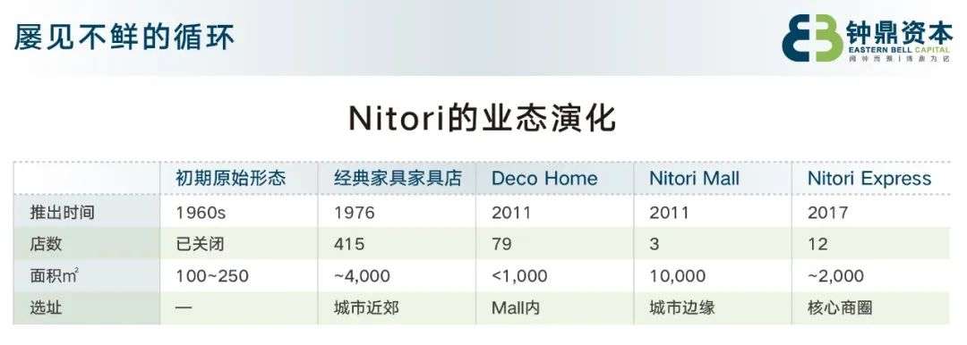 另一个例子来自Nitori,它目前的品类宽度并不宽,主要就是家具+家居,但它不同时期在本土主力开设的业态面积,也经历过由小变大变小又变大的过程。