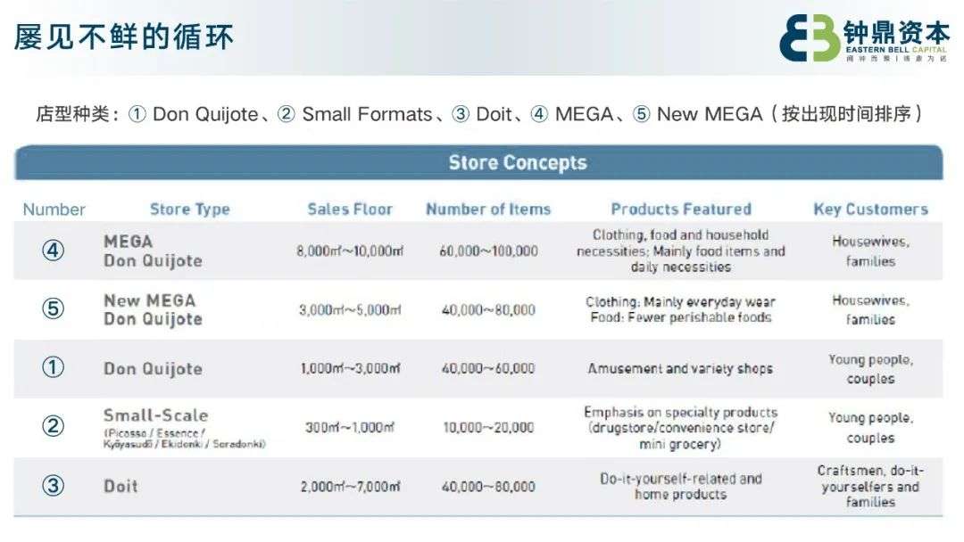 其最初的经典业态Don Quijote,面积在1000~3000平;后来主力拓展Small-Scale,也就是小型业态;再后来到2000~7000平的Doit和近万平的MEGA。而到了2000年,DQ开始主力开设New MEGA,占地3000-5000平方米。从不同时期其主力开发的业态,也可以看到前述的类似规律。