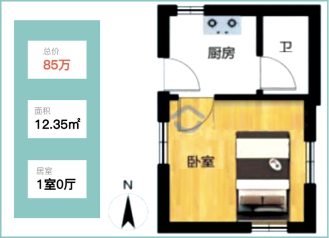 12.35平米,在二三线城市,可能只是一个仓储室的面积。然而房爷爷的分区却非常“精细”——卧室、卫生间、厨房三个区域都包括在内了,空间捉襟见肘。