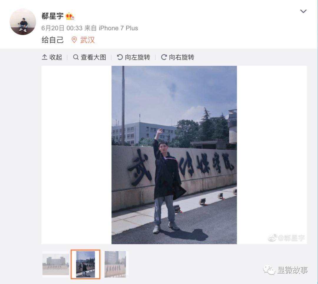 武汉夏季极其炎热,拍摄那天最高温度有35度,郗星宇穿着密不透风的学士服、一个人在烈日下摆拍、调角度,汗水浸湿了整件学士服。