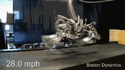 虽然负重增加了,波士顿动力公司又在琢磨能不能跑的更快。这之后2013年,他们又研发了Cheetah“猎豹”,它在实验室跑出了45千米/小时的速度,比博尔特在09年世界田径锦标赛的速度还要快,可以说是机器人界当之无愧的小飞人。