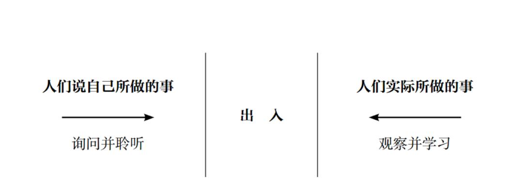 要明确这一出入,需要多重输入。你需要聆听人们讲了什么,并注意什么是他们没讲的,弄明白他们为什么要讲这些,然后仔细观察他们用什么方法做了哪些事。