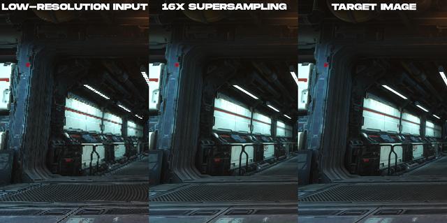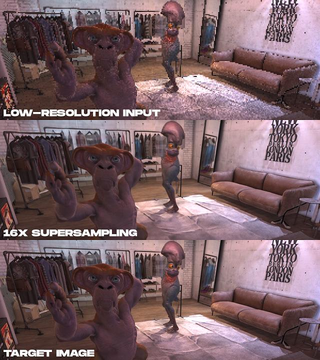 示例结果:从左到右是低分辨率颜色输入;所介绍方法的16x超采样结果;以及离线渲染的目标高分辨率图像。