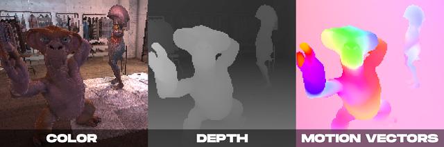用作神经超采样方法输入的示例渲染属性以低分辨率渲染,包括颜色、深度和密集运动矢量。