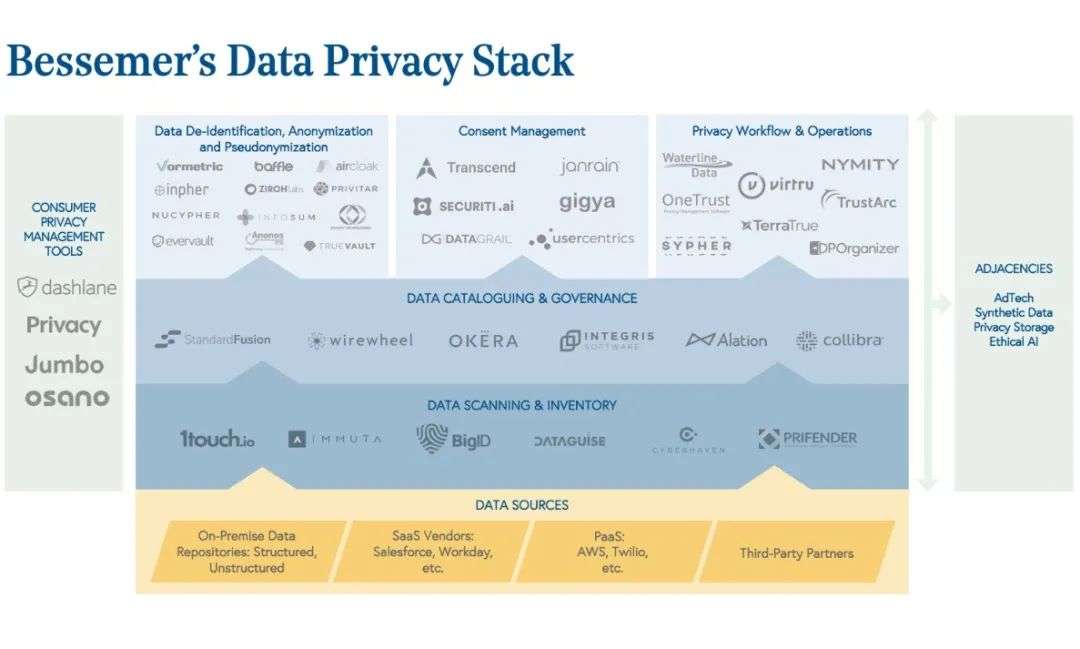 公司还必须能够响应数据主体(用户)访问请求(DSAR)和其他法规查询,让数据所有者能够有权获取并且操作自身数据。随着法规的健全和用户意识的认知提升,这些请求正在急剧增加。企业将需要新的软件定义解决方案来有效地管理这些流程。诸如OneTrust(2016年成立,累计融资4.1亿美金)之类的创业公司已经在这一领域获得了很高的估值。