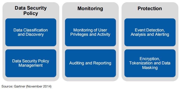针对数据处理不同阶段面临的安全问题,Gartner在几年前就提出了DCAP(Data-Centric Audit and Protection)的概念。