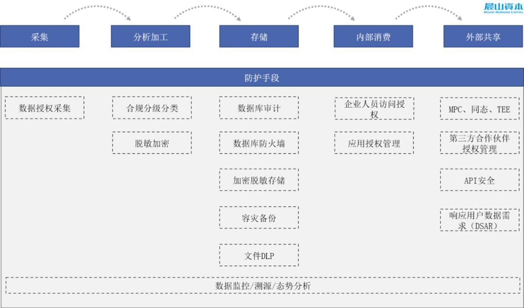 企业针对隐私数据处理的不同阶段面临的风险,总结下来同样可以分为几类防护手段: