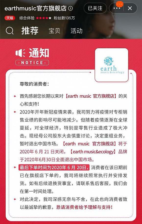 日本女装品牌Earth Music&Ecology宣布于6月30日正式退出中国市场,目前它已关闭了天猫和所有线下店铺。和它同属于STRIPE INTERNATIONAL的Samansa Mos2和E hyphen word gallery也关闭了在中国所有业务。