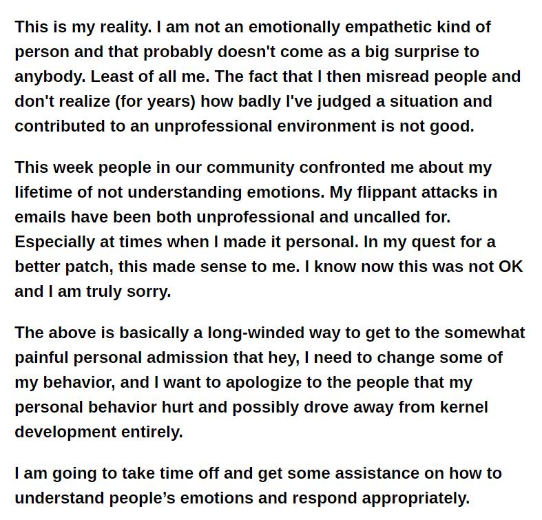 Torvalds在道歉信里表示,他不是一个具有共情心的人,他误会了大家,虽然是在寻求更好的补丁程序中,但也不应该流露坏情绪,维护之路漫长而艰辛,他不想因为自己的压力给大家带来痛苦,并保证会学着如何理解情绪而不伤害他人。