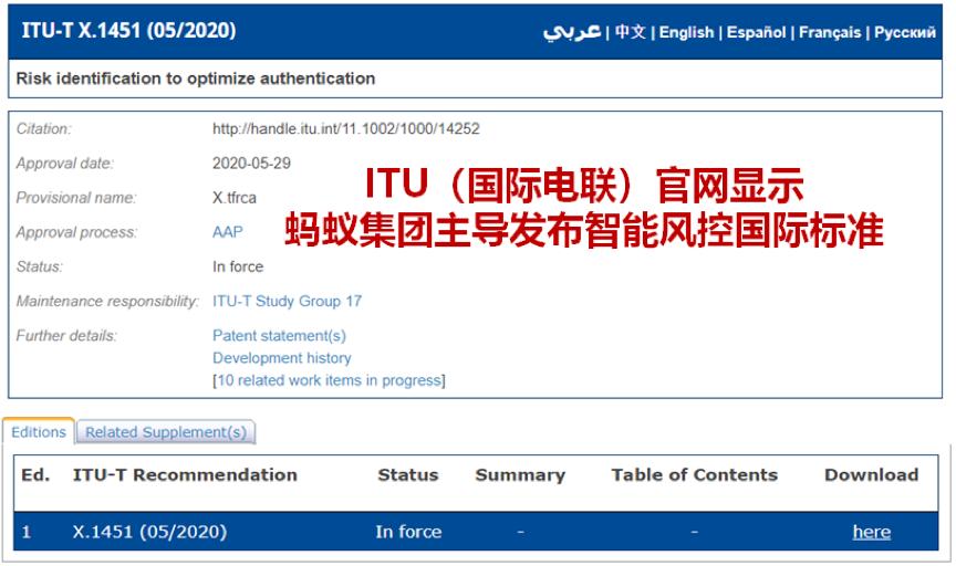 《Tech星球》消息,ITU(国际电联)官网显示,近日,由支付宝母公司蚂蚁集团主导编制的智能风控技术国际标准正式发布。