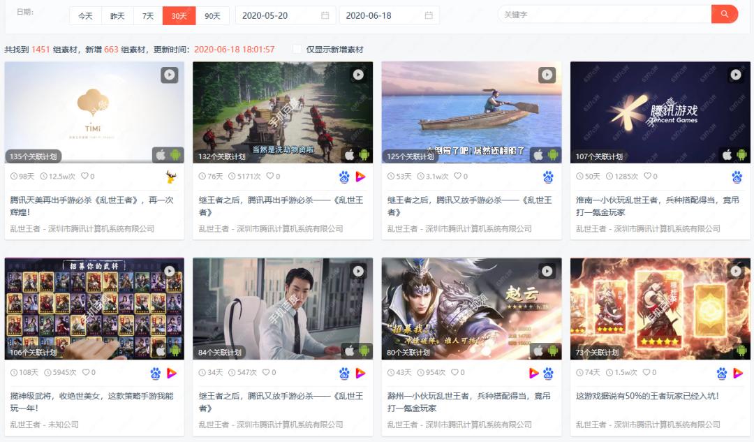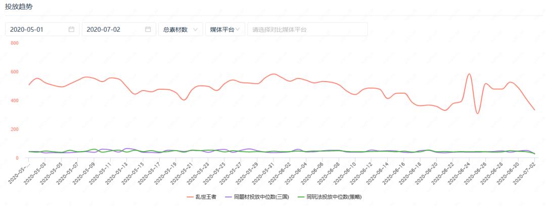 三、腾讯《乱世王者》日均投放素材超400组,字节跳动则以超休闲抢量
