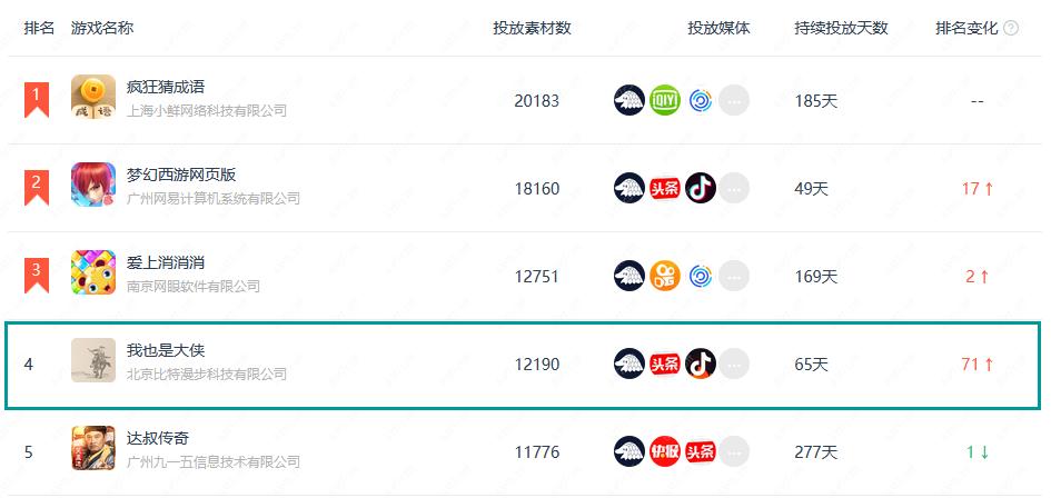 字节跳动方面,则是用多款超休闲突围买量市场,比如Ohayoo发行的新游《我也是大侠》,这款超休闲游戏已经跃升近30天买量榜TOP4的位置。