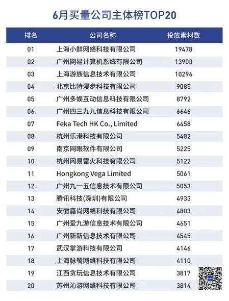 DataEye-ADX平台表示,从6月份买量公司主体榜单中,可以看到除了网赚游戏头部公司,腾讯、网易、阿里等游戏大厂以绝对优势“垄断”买量市场。
